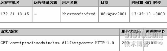 上面的項目表明:Microsoft 域中 IP 地址為 172.21.13.45、名為 Fred 的用戶在 2001 年 4 月 8 日下午 5:39 分發(fā)出一條 HTTP GET 命令(即,下載一個文件)。該請求將 3401 個字節(jié)的數(shù)據(jù)正確無誤地返回給名為 Fred 的用戶。