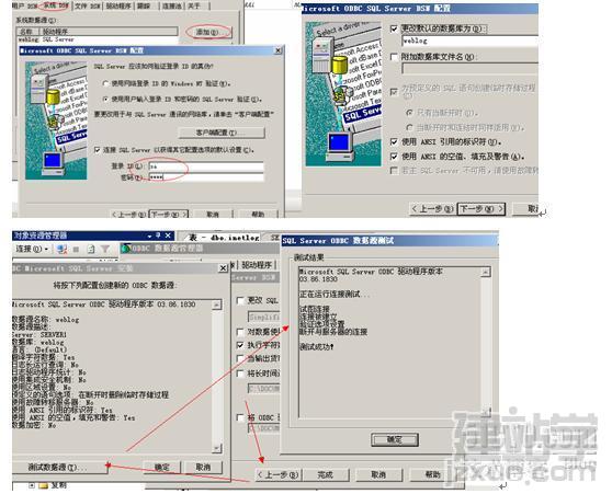 3,在IIS服務(wù)器上,打開ODBC管理器,建立一個系統(tǒng)DSN,DSN名叫WEBLOG,驅(qū)動選擇SQL SERVER,服務(wù)器就輸入SQL SERVER服務(wù)器的IP地址,驗證,SQL SERVER驗證,輸入用戶名和密碼,數(shù)據(jù)庫選擇剛建好的WEBLOG數(shù)據(jù)庫,最后,測試,通過了就OK.