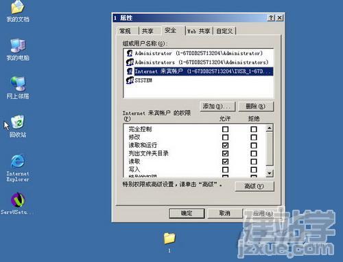 如果重新安裝IIS依舊不能解決問(wèn)題的話,故障根源就不在于IUSER_計(jì)算機(jī)名(internet來(lái)賓帳戶)了,我們應(yīng)該從目錄權(quán)限下手解決問(wèn)題。找到我們要發(fā)布的頁(yè)面所在文件夾(網(wǎng)站目錄),然后在其上點(diǎn)右鍵選擇“屬性”,在打開的屬性窗口中找到“安全”標(biāo)簽,如果這里沒(méi)有IUSER_計(jì)算機(jī)名(internet來(lái)賓帳戶)訪問(wèn)權(quán)限的存在,那么問(wèn)題就在于此。(如圖6)