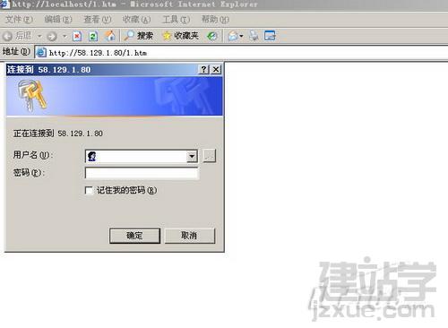 接下來(lái)在其他計(jì)算機(jī)或更改本機(jī)訪問(wèn)地址為自身IP后(例如58.129.1.80/1.htm)卻出現(xiàn)了一個(gè)要求輸入用戶名和密碼的對(duì)話框,這就是上文網(wǎng)友遇到的問(wèn)題。(如圖2)