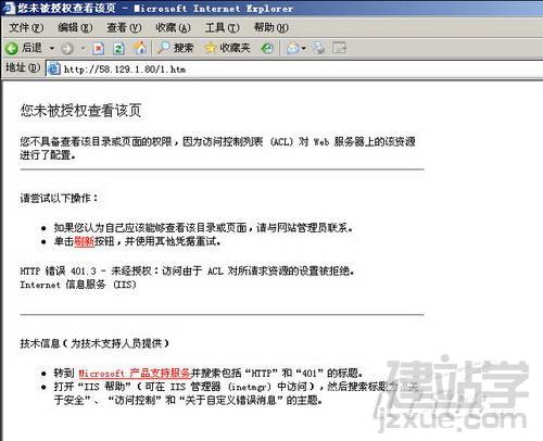 實(shí)際上對(duì)于一個(gè)站點(diǎn)我們?cè)L問(wèn)他應(yīng)該不需要輸入用戶名和密碼的,站點(diǎn)訪問(wèn)都應(yīng)該是匿名的。就算我們?cè)趯?duì)話框中輸入了相關(guān)的用戶名和密碼也無(wú)法通過(guò)驗(yàn)證,頁(yè)面會(huì)顯示——“您未被授權(quán)查看該頁(yè),您不具備查看該目錄或頁(yè)面的權(quán)限,因?yàn)樵L問(wèn)控制列表ACL對(duì)WEB服務(wù)器上的該資源進(jìn)行了配置”。(如圖3)