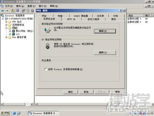除了以上幾個(gè)容易設(shè)置錯(cuò)誤造成訪問(wèn)IIS發(fā)布的WWW站點(diǎn)出現(xiàn)用戶名與密碼提示外,在IIS設(shè)置中如果配置不當(dāng)也會(huì)出現(xiàn)上述問(wèn)題。例如在IIS中“網(wǎng)站”上點(diǎn)右鍵選擇“屬性”,然后找到“目錄安全性”標(biāo)簽,接下來(lái)點(diǎn)“身份驗(yàn)證和訪問(wèn)控制”。(如圖9)