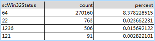 selectscWin32Status,count(*)AScount,(count(*)*100.0/@recCount)AS[percent]