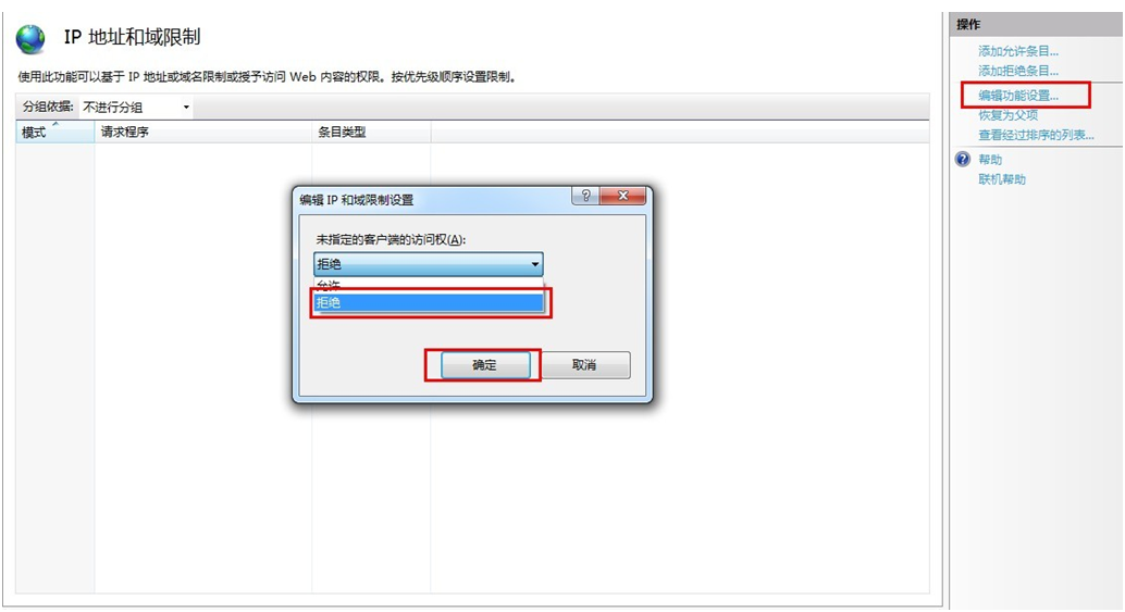 2、雙擊“IP地址和域限制”,進入IP設置主界面,進入主界面后,在右邊菜單欄中有一個“編輯功能設置”鏈接,點擊“編輯功能設置”鏈接,在彈出的框中我們選擇未指定的客戶端的訪問權為拒絕,如下圖:
