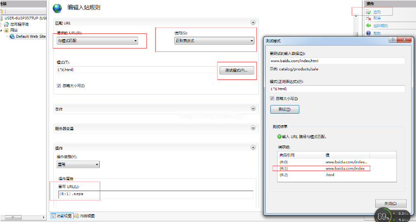 按照我選的去設置,在模式里面輸入(.*)(.html),然后去測試,你會發現匹配到的是R:1,所以你在重寫URL中鍵入:{R:1}.aspx就可以了,最后點擊右上角的應用就好了