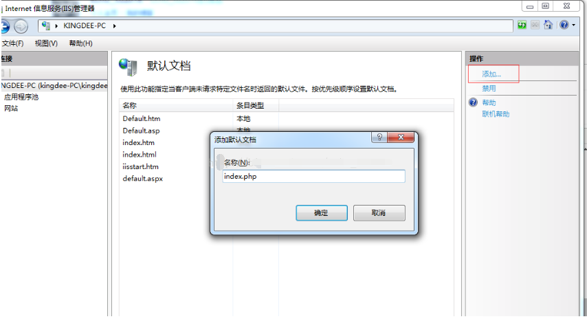 2、單擊"文檔"頁簽,在默認(rèn)內(nèi)容文檔中添加index.htm、index.html、index.php三個文件,并將所有默認(rèn)文檔排序,順序盡量靠前。完成后,單擊"確定",關(guān)閉站點(diǎn)屬性配置窗口,回到IIS管理器主界面。(若沒有默認(rèn)index可自行添加)