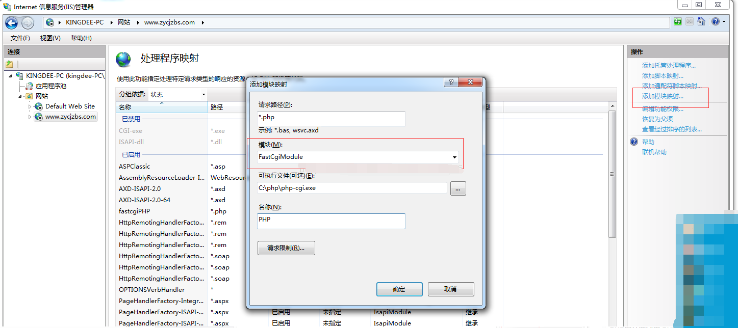 1、控制面板-》管理工具-》信息服務(wù)管理器,在網(wǎng)站主頁的功能中選擇處理映射功能,添加phpcgi模塊,點(diǎn)擊確定完成