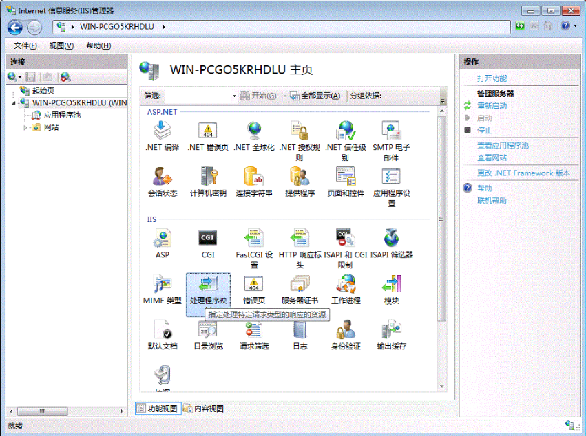 然后進(jìn)入iis7,打開IIS控制臺,在左邊樹中選最頂級結(jié)點(diǎn),也就是你的電腦名,然后在中間(功能視圖)里打開“處理程序映射”,