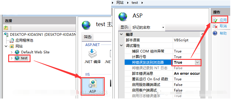 3、此時(shí)可以看到,雖然不是http500錯(cuò)誤了,但只是說發(fā)生了一個(gè)錯(cuò)誤,asp并沒有返回具體的錯(cuò)誤信息。此時(shí)需要設(shè)置asp的調(diào)試屬性,將錯(cuò)誤發(fā)送到瀏覽器設(shè)置為true。選中網(wǎng)站,在功能視圖中找到ASP并雙擊,找到調(diào)試信息中的“將錯(cuò)誤發(fā)送到瀏覽器”設(shè)置為true,然后應(yīng)用。如下圖: