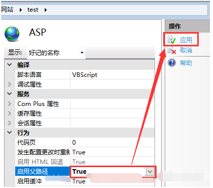 5、分析原因是由于asp頁(yè)面代碼中使用了相對(duì)路徑,而IIS安裝完后默認(rèn)的asp是不允許使用相對(duì)路徑(即父路徑)的。此時(shí)需要將asp行為屬性中的啟用父路徑設(shè)置為true。如下圖: