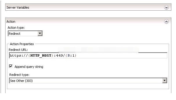 <actiontype="Redirect"url="https://{HTTP_HOST}:449/{R:1}"redirectType="SeeOther"/>