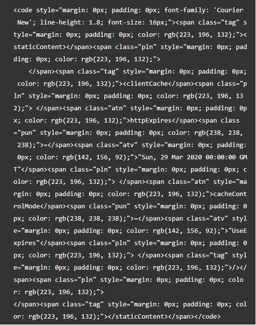 以上配置即可緩存靜態文件1周,我們也可指定緩存的過期時間,如下: