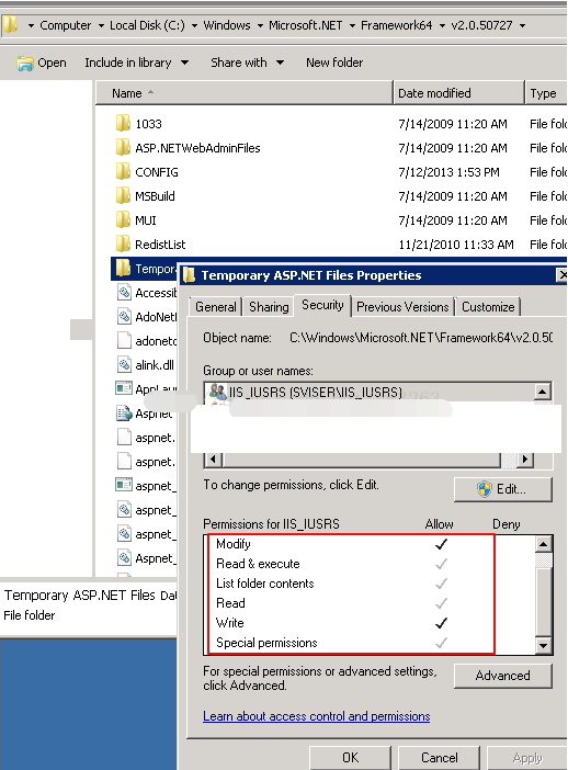 檢查帳號IIS_IUSRS在Windows/Mircosoft.Net/Framework/V2.0.50727/TemporaryASP.NET的讀寫權(quán)限.(注意Framework版本和系統(tǒng)是32位還是64位,變更路徑)