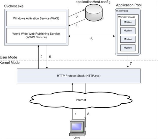 由圖可知,所有的請求會被服務器中的http.sys組件監聽到,它會根據IIS中的Metabase查看基于該Request的Application屬于哪個ApplicationPool,如果該ApplicationPool不存在,則創建之。否則直接將Request發到對應ApplicationPool的Queue中。