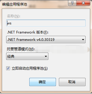 3、繼續(xù)做以下設(shè)置:在自動生成的“ws”(由2中網(wǎng)站而自動生成)的應(yīng)用程序池中,找到ws應(yīng)用程序池,右鍵菜單并選擇“屬性”,選擇4.0的框架(在visualstudio使用2010的4.0的框架生成的),托管管道模式選擇“經(jīng)典”,并勾選“立即啟動應(yīng)用程序池”(要保證應(yīng)用程序池要處于運行,未運行將看不到效果)。