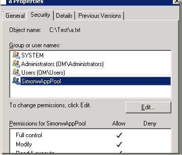 上面提到的身份標識選項中你可以選擇他,但他只是一個統稱,并不存在實際的這個命名.他依賴你的ApplicationPool的名稱,例如我的ApplicationPool名字叫做:SimonwAppPool,那么這個虛擬標識的全名是:IISAppPool/SimonwAppPool運行在此ApplicationPool下的WorkerProcess從任務管理器中可以看到w3wp.exe是在SimonwAppPool這個用戶下運行的.可以在文件系統中對這個帳戶分配權限.這么做的好處是能夠將能夠將權限分離開來做粒度更細的配置,不像是NetworkService有很多應用基于此,設置一個權限影響一大片。