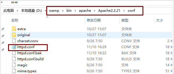 第一步:我們進入自己的wampservicer安裝文件夾,按照這個路徑找到APACHE的配置文件。