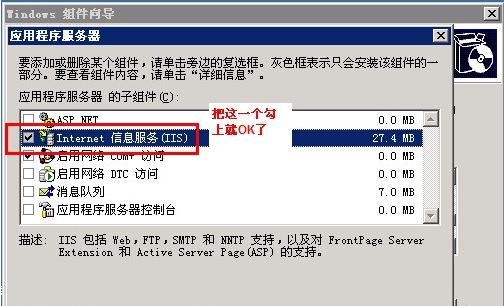 IIS的添加:請進入“控制面板”,依次選“添加/刪除程序→添加/刪除Windows組件”,將“Internet信息服務(IIS)”前的小鉤去掉(如有),重新勾選中后按提示操作即可完成IIS組件的添加。用這種方法添加的IIS組件中將包括Web、FTP、NNTP和SMTP等全部四項服務。