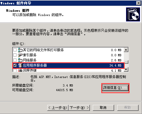 3、在彈出的windows組件向導中選中”應用程序服務器”,然后點擊“下一步”按鈕。ps:點擊右下角的”詳細信息“按鈕可以自定義安裝應用程序服務器的子組件。