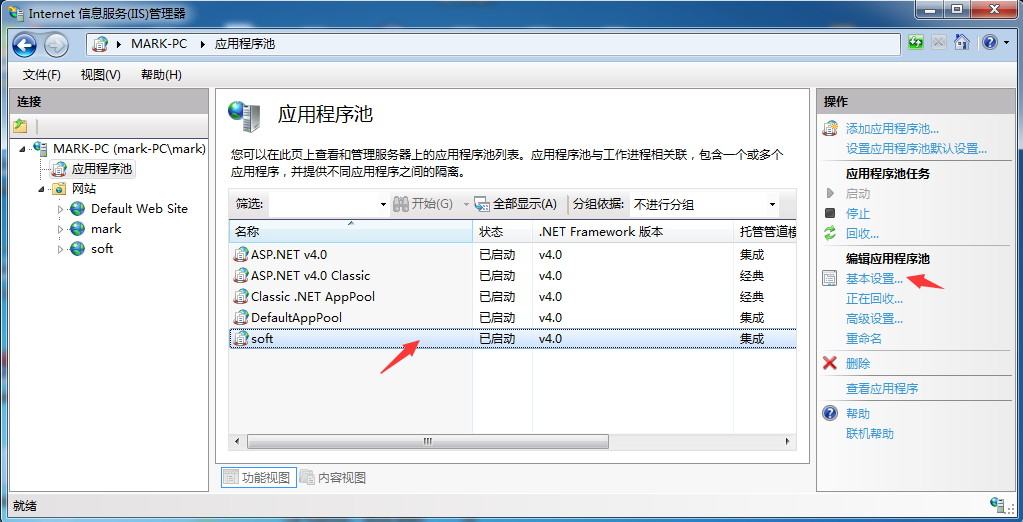 第八步:選中目標程序池,點擊基本設置,修改其.netframework版本保證與你的項目是同一版本,修改其他基本設置和權限。