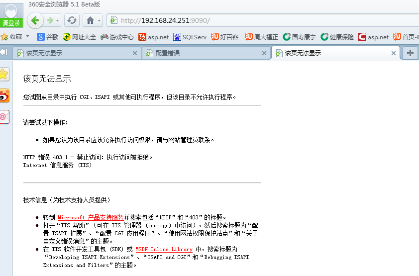 總結:部署過程中會遇到不同的錯誤提示信息,總之一點:首先檢查.NET版本和執行權限的設置問題(以下是本人部署中遇到的錯誤信息,可以歸為三類類:亂碼、服務器不可用、無法顯示)。