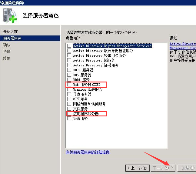 3、然后點擊“添加角色”,選擇“web服務器(IIS)”和“應用程序服務器”,點擊“下一步”;