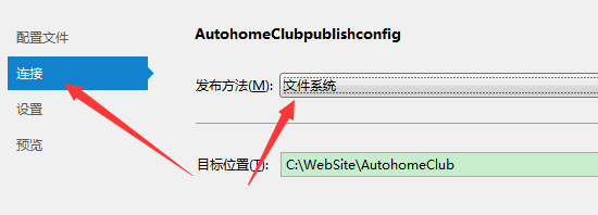(2)、接著在“發布web”界面中,點擊“連接”,在“發布方法”處選擇“文件系統”,然后自己選擇一個路徑保存;