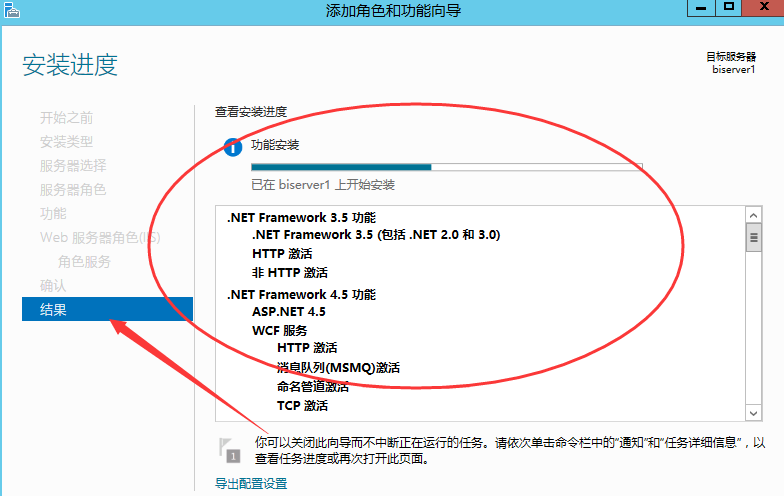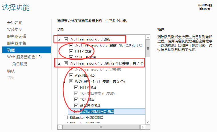 5、在“功能”里面把“.NETFramework3.5功能”、“.NETFramework4.5功能”下面的選項全部都勾選上;