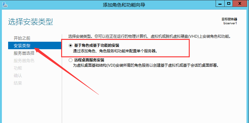 2、在彈出的界面中,我們點擊“安裝類型”,選擇“基于角色或基于功能的安裝”;