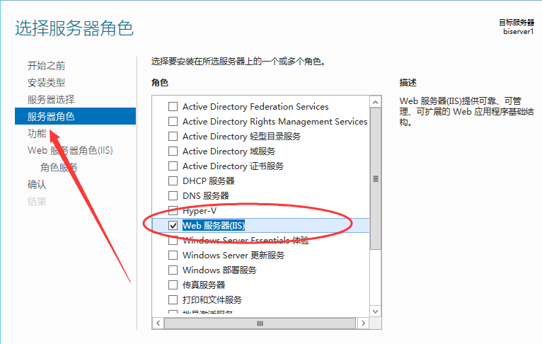 4、在“服務器角色”中我們選擇“web服務器(IIS)”,勾選上;