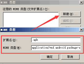 4、打開MIME類型設置界面以后,我們點擊“新建”,然后在擴展名中填入“.apk”,在MIME類型中填入application/vnd.android.package-archive,然后點擊確定;