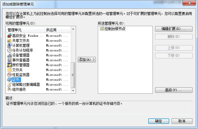 2. 點擊 【文件】 , 選擇【添加/刪除管理單元】,【可用管理單元】 選擇 【 證書】 點擊添加。彈出窗口,選擇 【 計算機賬戶】,確定即可。