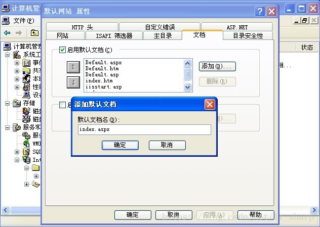 3、選擇【文檔】選項卡–添加index.aspx進去,作為默認網頁–點擊確定