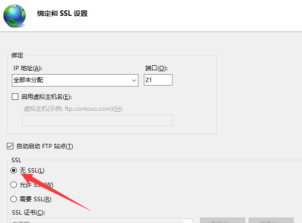 6、在“綁定和SSL設(shè)置”中我們輸入ip地址和端口,把“自動(dòng)啟動(dòng)FTP站點(diǎn)”勾選上,在SSL處選擇“無SSL”,然后點(diǎn)擊“下一步”;