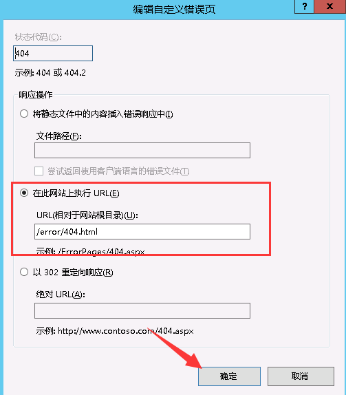 6、在彈出的“編輯自定義錯誤頁”對話框中,我們選擇“在此網站上執行URL”,然后填寫URL,好了之后點擊“確定”;