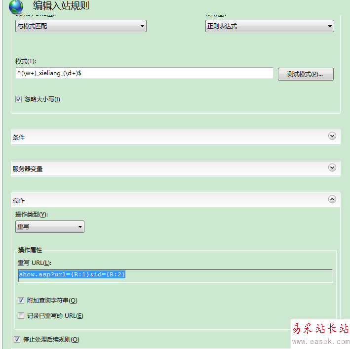名稱自己起個就行,然后“匹配URL”里基本可以默認,只需要自己填寫上“模式”即可,這里是正則表達式,比如:^(/w+)xieliang(/d+)$ 這其中的^是開始,$表示結束,(/w+)表示字母,數字任意,(/d+)表示只能為數字,(.*)為所有,更多正則請看:正則表達式