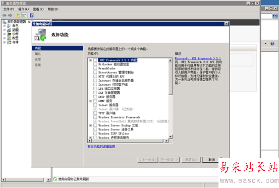 在“添加功能”向?qū)?duì)話框中,選擇.Net Framework,點(diǎn)擊下一步執(zhí)行安裝。