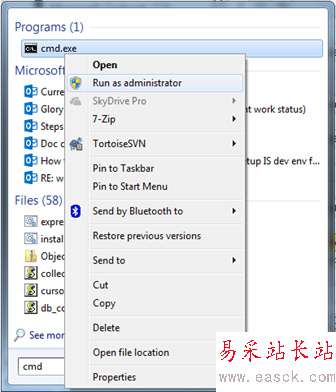 在開始->查找框中輸入cmd,右擊cmd.exe,選擇Run as administrator,進(jìn)入命令行界面。