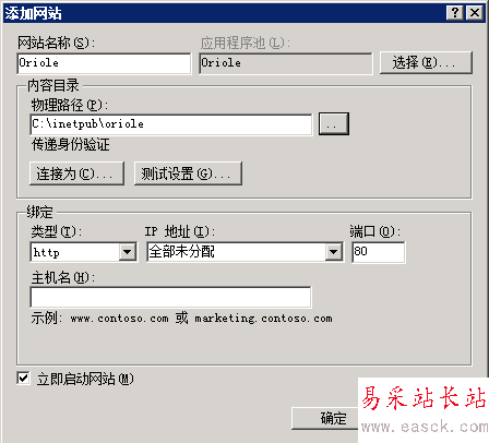 右擊“網(wǎng)站“,選擇添加網(wǎng)站,在“添加網(wǎng)站”對(duì)話框中輸入網(wǎng)站名稱,選擇項(xiàng)目所在的物理路徑,然后給網(wǎng)站分配端口。
