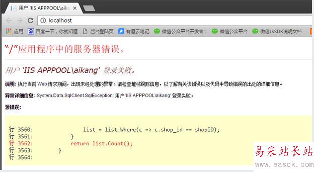 問題描述:用戶 'IIS APPPOOL/aikang' 登錄失敗。在VS里面打開能正常運行,在IIS里面打開就總是提示這個錯誤,看網(wǎng)上說是修改應(yīng)用程序域 ,進程模型里面的標識,修改成LocalSystem后,又提示:【無法打開登錄所請求的數(shù)據(jù)庫 "ikang_WXshop"。登錄失敗。用戶 'NT AUTHORI...