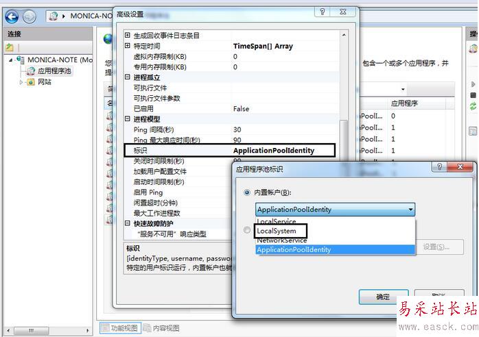 其他回答:IIS里,應(yīng)用程序池,到你的網(wǎng)站名字,右鍵“高級設(shè)置”,點開“標識”的下拉框,選擇localsystem即可。