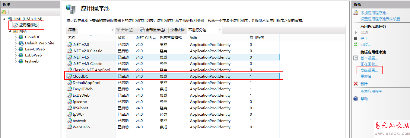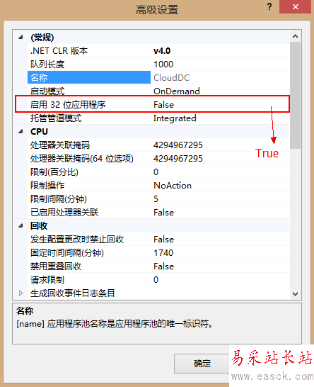 1)、進入應用程序池=》選中網站=》點擊右側”高級設置“=》將運行32位選項改為"True"