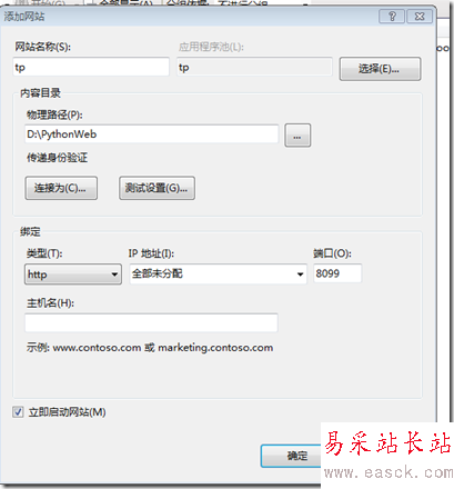 6.建立新的web應用程序:默認站點->右鍵添加應用程序->別名tesstPy,應用程序池選擇python,物理路徑例如:D:/Python/test,確定.