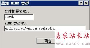 3.在新窗口中,在文件擴(kuò)展名處填寫(xiě)“.rmvb”,在MIME類(lèi)型處填寫(xiě)“application/vnd.rn-realmedia”,確定。不用重啟IIS服務(wù),現(xiàn)在IIS就能支持rmvb格式文件的下載了。如果還需要支持其它類(lèi)型的文件,也可參考進(jìn)行配置,注意在MIME類(lèi)型和擴(kuò)展名的不同寫(xiě)法。