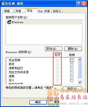 第二:在網站所在的文件夾上點右鍵,選擇“屬性”-->安全,給Everyone或者Users(根據系統不同選擇)完全控制的權限,也就是在允許下面全打上√,然后確定。
