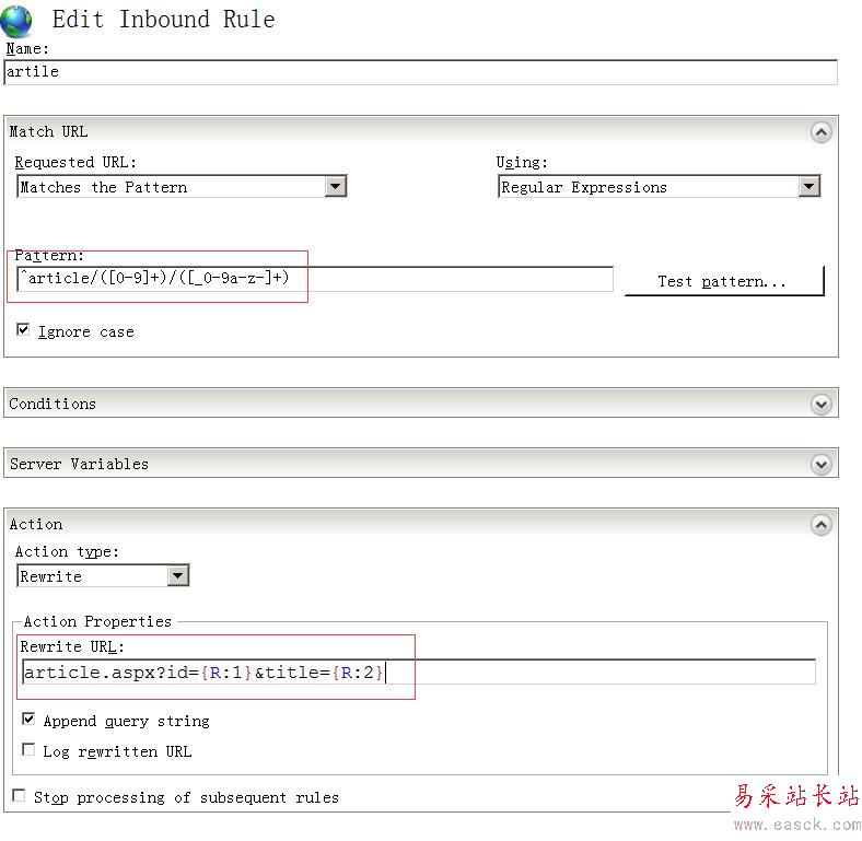 因為我們創建一個支持重寫URL的規則,因此規則類型是“Rewrite“。重寫字符串(Rewrite UR)“article.aspx?id={R:1}&title={R:2}”指定一個新值用于輸入被重寫的URL。參數我們使用“ {R:1} ”和“{R:2}”,他們將返回一組通過規則匹配定義的引用(reference)。關于返回引用( back reference)你可以參考:URL Rewrite Module Configuration Reference,有關創建重寫規則的更多內容見:Creating rewrite rules for the URL Rewrite Module