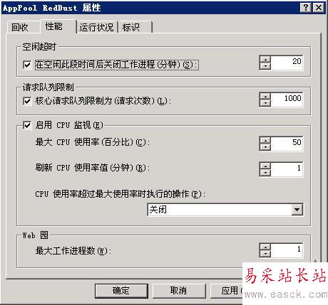 首先是對CPU的限制:在啟用cpu監(jiān)視后,我設(shè)置該應(yīng)用程序池最大的cpu使用率為50%。設(shè)置刷新cpu時間為1分鐘,設(shè)置操作為“關(guān)閉”。最大工作進程數(shù)設(shè)置為1。這個意思是,IIS刷新檢測該獨立池的CPU使用情況時間為1分鐘,如果超過設(shè)置的cpu限制50%,就會發(fā)出關(guān)閉池的指令,要求池在指定的時間內(nèi)關(guān)閉。如果池成功在這個時間內(nèi)關(guān)閉,IIS會重啟動一個新池,此段時間很短,一般不會有什么感覺,池就重新開啟了,對于訪問網(wǎng)站的人基本是不會有感覺的。但如果池沒有在指定時間內(nèi)關(guān)閉,IIS就會強行關(guān)閉它一個刷新CPU時間。在這個停止的時間內(nèi),網(wǎng)站無法訪問,提示“Service Unavaliable”。