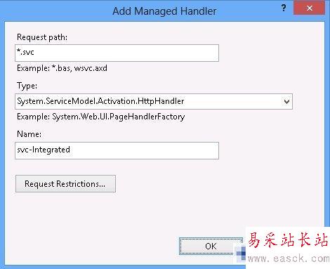 最近在做Silverlight,Windows Phone應用移植到Windows 8平臺,在IIS8中測試一些傳統WCF服務應用,發現IIS8不支持WCF服務svc請求,后來發現IIS8缺少對WCF服務的Managed Handler,按照以下步驟添加后,IIS8即支持WCF服務。