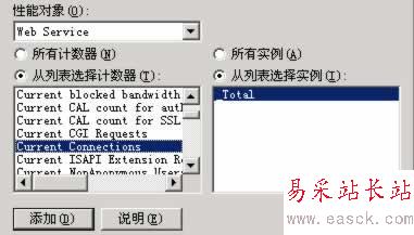 三、在“添加計數器”窗口,“性能對象”選擇Web Service,“從列表選擇計數器”選中Current Connection,“從列表選擇實例”選中你要統計的站點,最后點擊“添加”按鈕