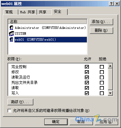 最終確保administrator、system和web01對該文件夾都有完全控制權限。